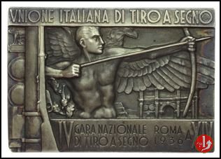 Medaglia uniface rettangolare coniata, realizzata nel 1936 per ricordare la Gara Nazionale di Tiro a segno di Roma.