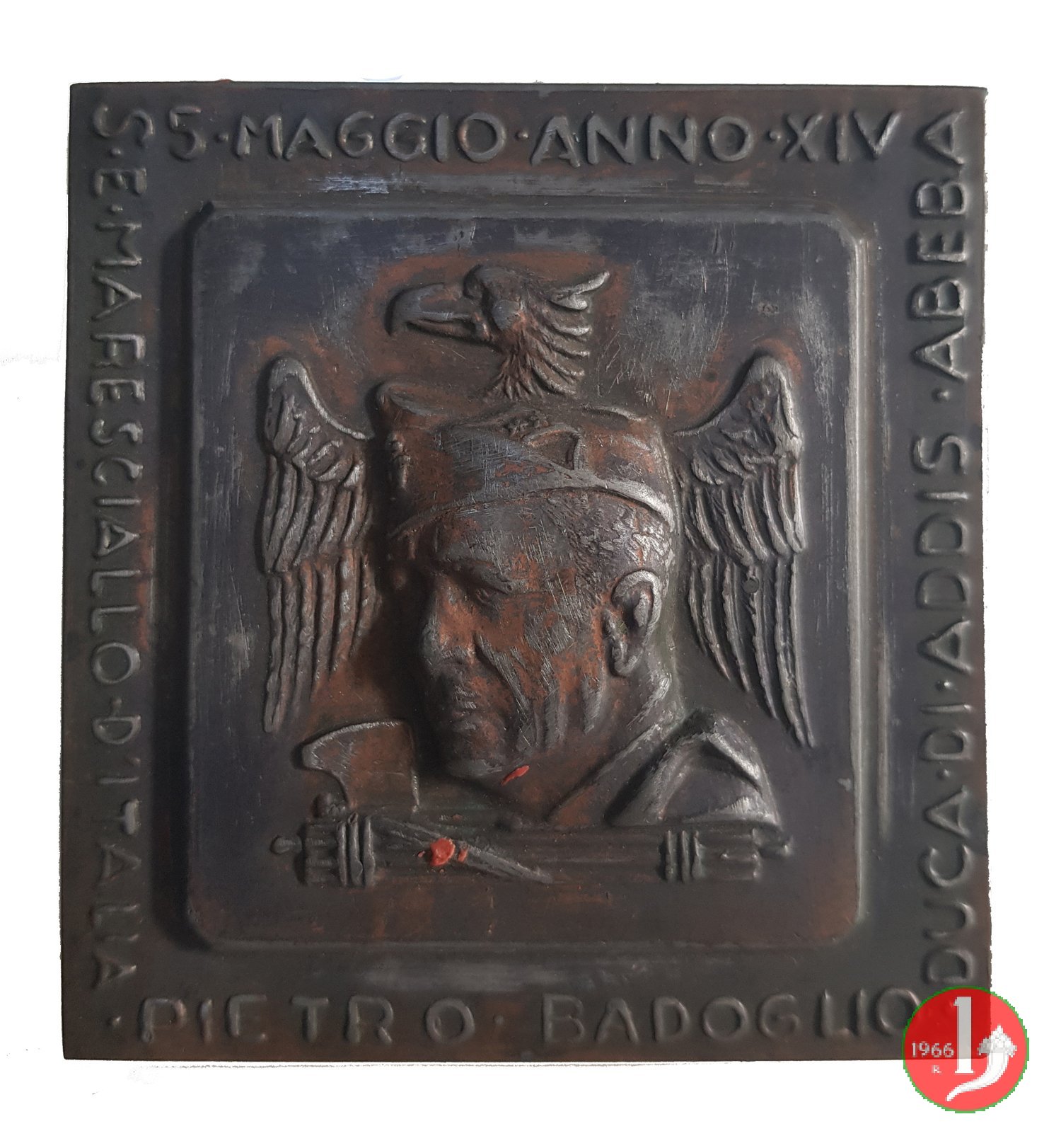 Placchetta rettangolare fusa, realizzata il 05-05-1936 in ricordo della nomina reale a Duca di Addis Abeba del maresciallo Pietro Badoglio (1871-1956).