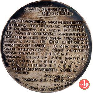 nel campo: A S.E. GRAZIANI = NEGHELLI = (fascio) = LA VITTORIOSA CONCLUSIONE = DELLA BATTAGLIA CONTRO = L'ARMATA DI RAS, DESTA = HA FATTO VIBRARE L'ORGOGLIO = L'ANIMO DEL POPOLO ITALIANO =....A V.E. IL MIO PIU' VIVO = COMPIACIMENTO E IL MIO ELOGIO = AGLI UFFICIALI E ALLE TRUPPE = SONO SICURO CHE SOTTO = LA FORTE GUIDA DI V.E. = RAGGIUNGERANNO = VITTORIOSAMENTE ALTRE = METE = MUSSOLINI = ROMA 22 • 1 • XIV = M. NELLI INC. FIRENZE