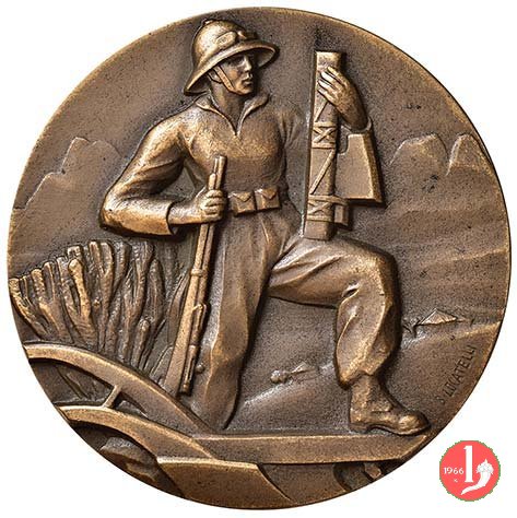 militare in piedi e volto a dx regge fascio e carabina e pone piede su aratro, sullo sfondo paesaggio africano