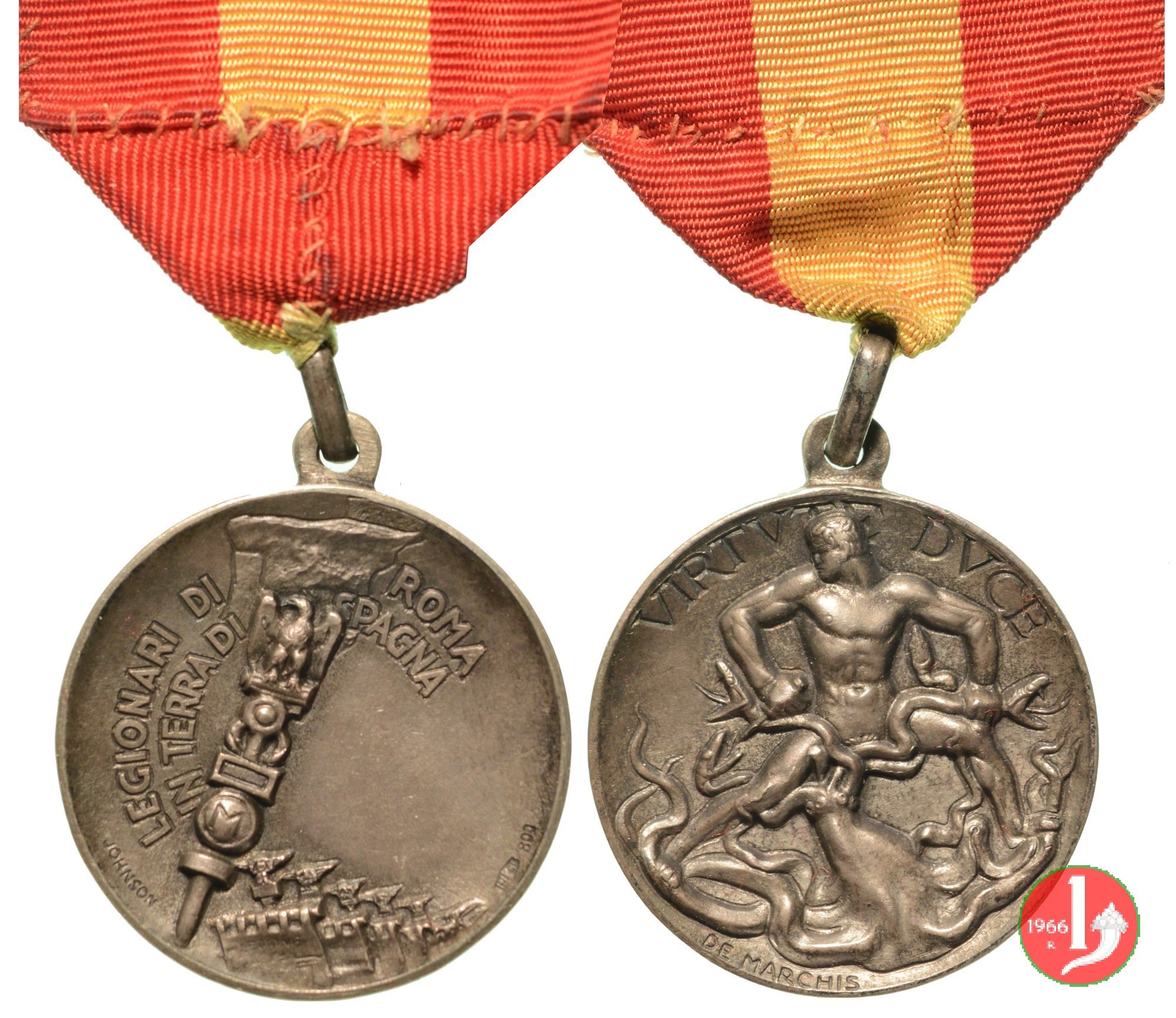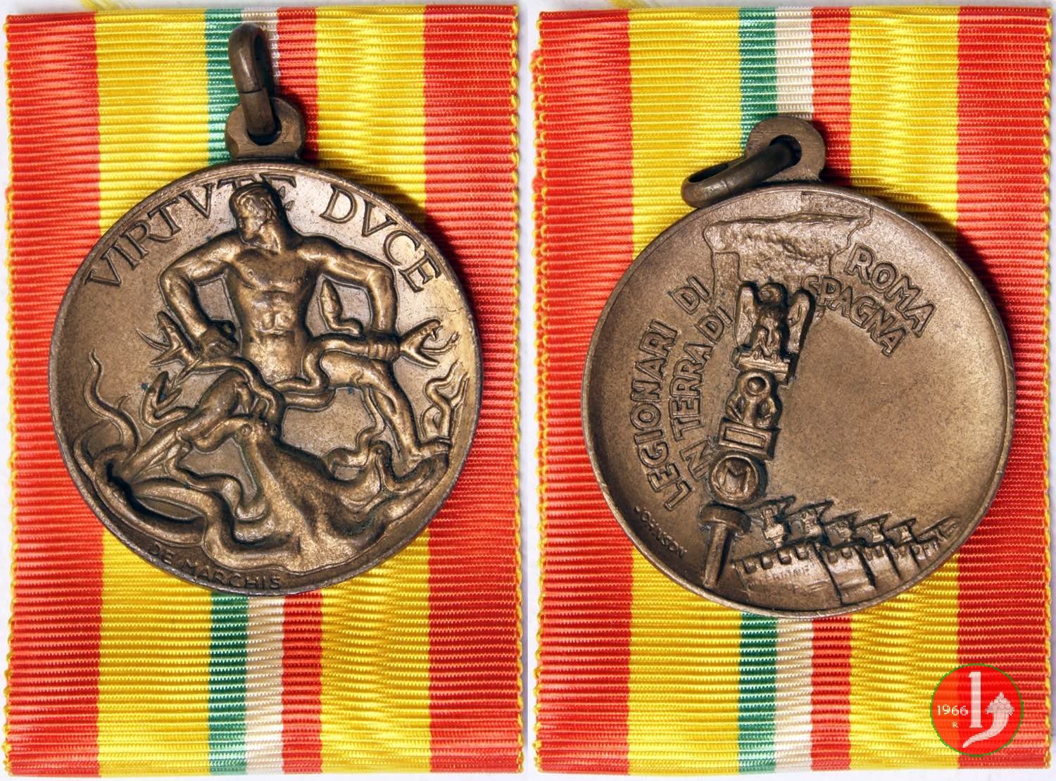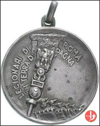 Medaglia coniata, realizzata con fondo opaco o satinato dallo Stabilimento Stefano Johnson di Milano, per decorare i legionari impiegati nella guerra di Spagna. Venne distribuita con nastrino a pali gialli e rossi.