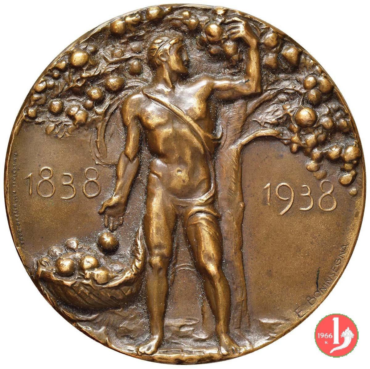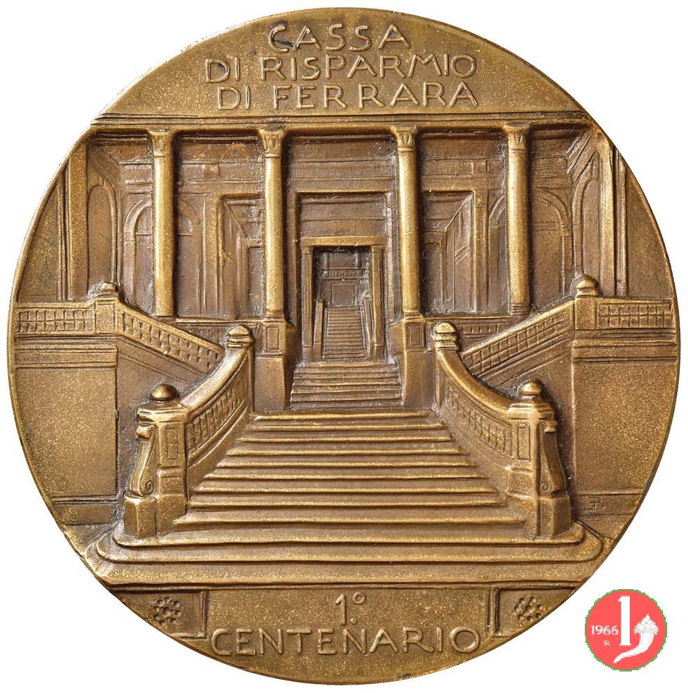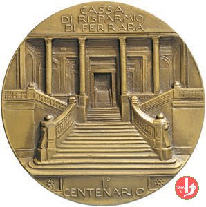 | Medaglia coniata, realizzata nel 1938 dallo Stabilimento Lorioli di Milano, per celebrare il centenario della Cassa di Risparmio di Ferrara. | ||||||