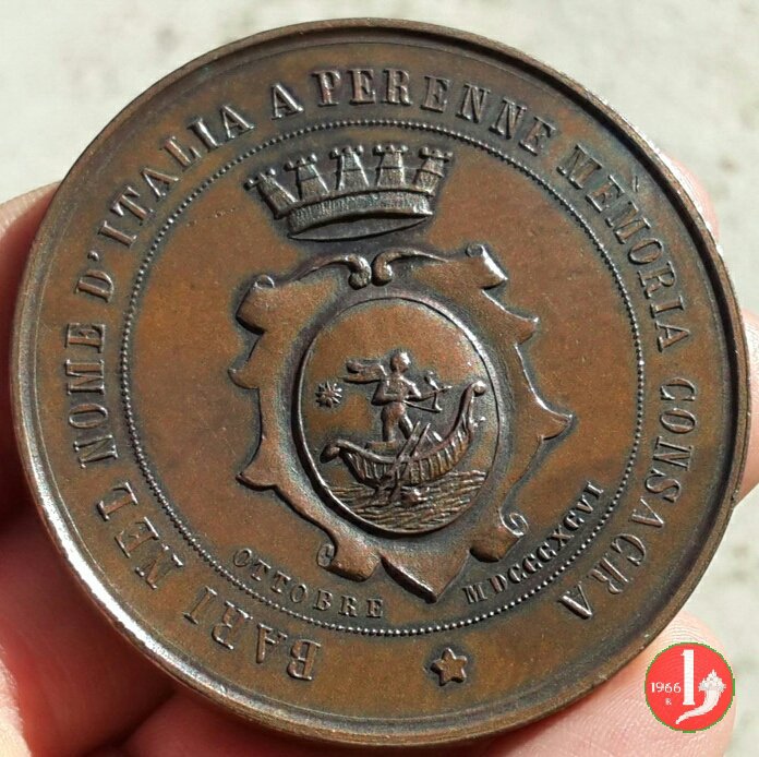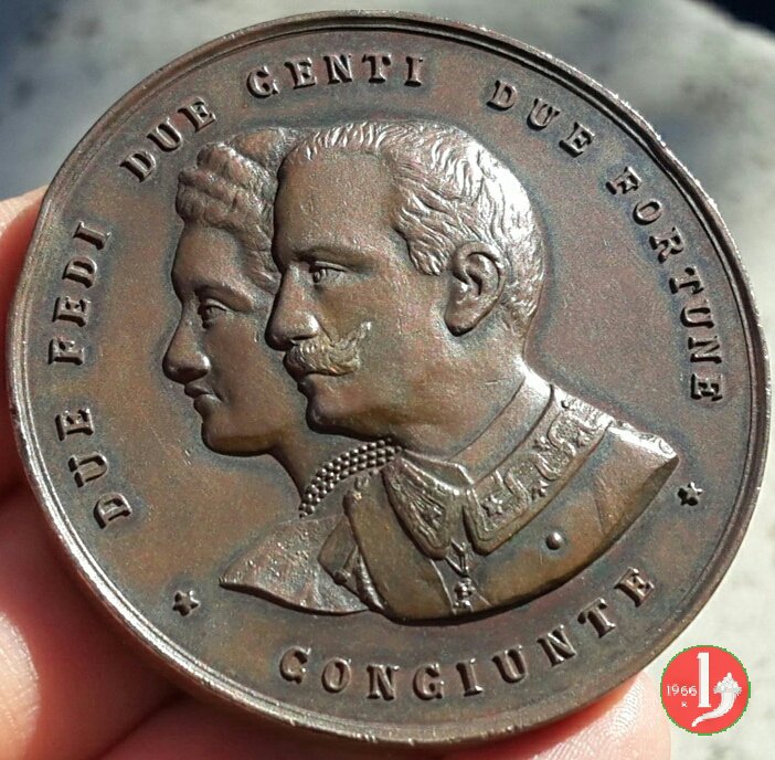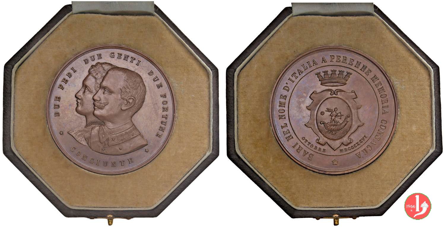 | Medaglia coniata, emessa il 24-10-1896 per ricordare il matrimonio tra Vittorio Emanuele Principe di Napoli e Elena del Montenegro che avvenne a Roma. In particolare ricorda l'arrivo in Italia della principessa Elena che sbarcò a Bari il 21 ottobre e, prima del matrimonio, per assecondare il desiderio della regina Margherita, abiurò il credo ortodosso e si convertí alla fede cattolica nella basilica di S. Nicola a Bari. | ||||