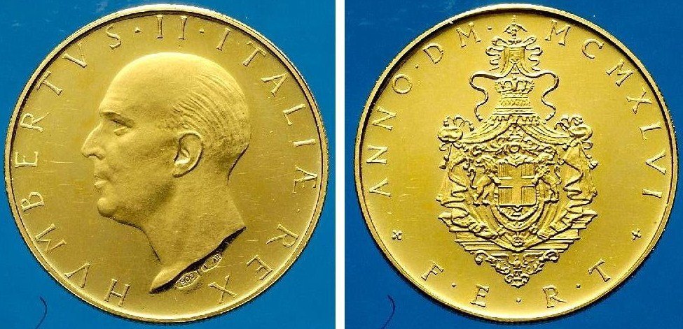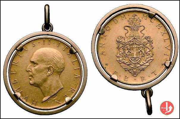 Medaglia coniata datata 1946, ma eseguita successivamente (in vari anno probabilmente a partire dal 1960 circa) dallo Stabilimento UnoAerre di Arezzo, a ricordo del breve regno di Umberto II Savoia. | |||||