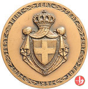 entro cerchio di nodo savoia FERT nodo savoia : Stemma Savoia coronato, entro panneggio d'ermellino e cinto dal Collare della SS. Annunziata
