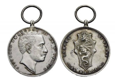 | Medaglia coniata, al merito del Comune di Terni. Esistono altre due versioni note (I° Tipo) con la testa del Re piú acerba volta a sx (1900 circa) e al verso lo stemma entro scudo ovale e il II° tipo con la testa del Re volta a sx. | |||||