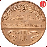 | Medaglia coniata, emessa nel 1914, per ricordare il centenario di fondazione dell'Arma dei Carabinieri. | ||||||