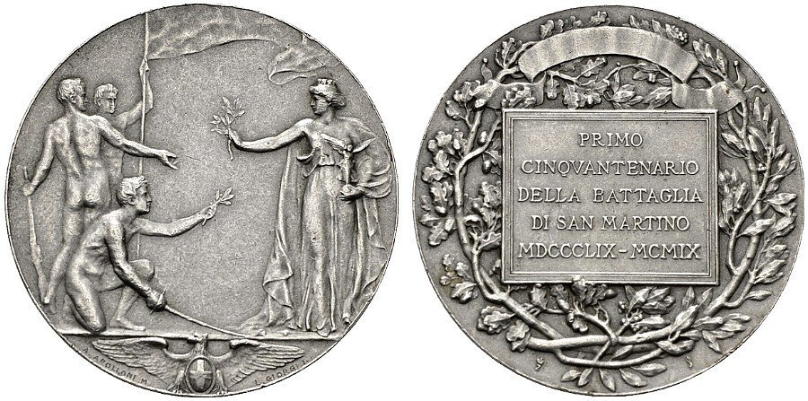 entro targa, su rami d'alloro e quercia, fregiati da nastro in alto: PRIMO = CINQVANTENARIO = DELLA BATTAGLIA = DI SAN MARTINO = MDCCCLIX-MCMIX