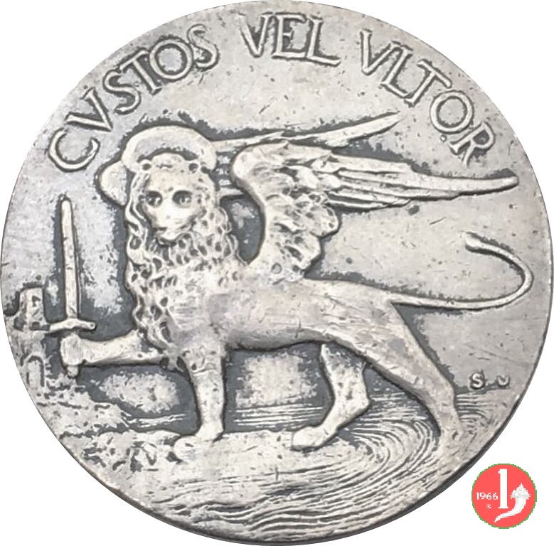 Leone di San Marco nimbato e volto a sx, regge spada