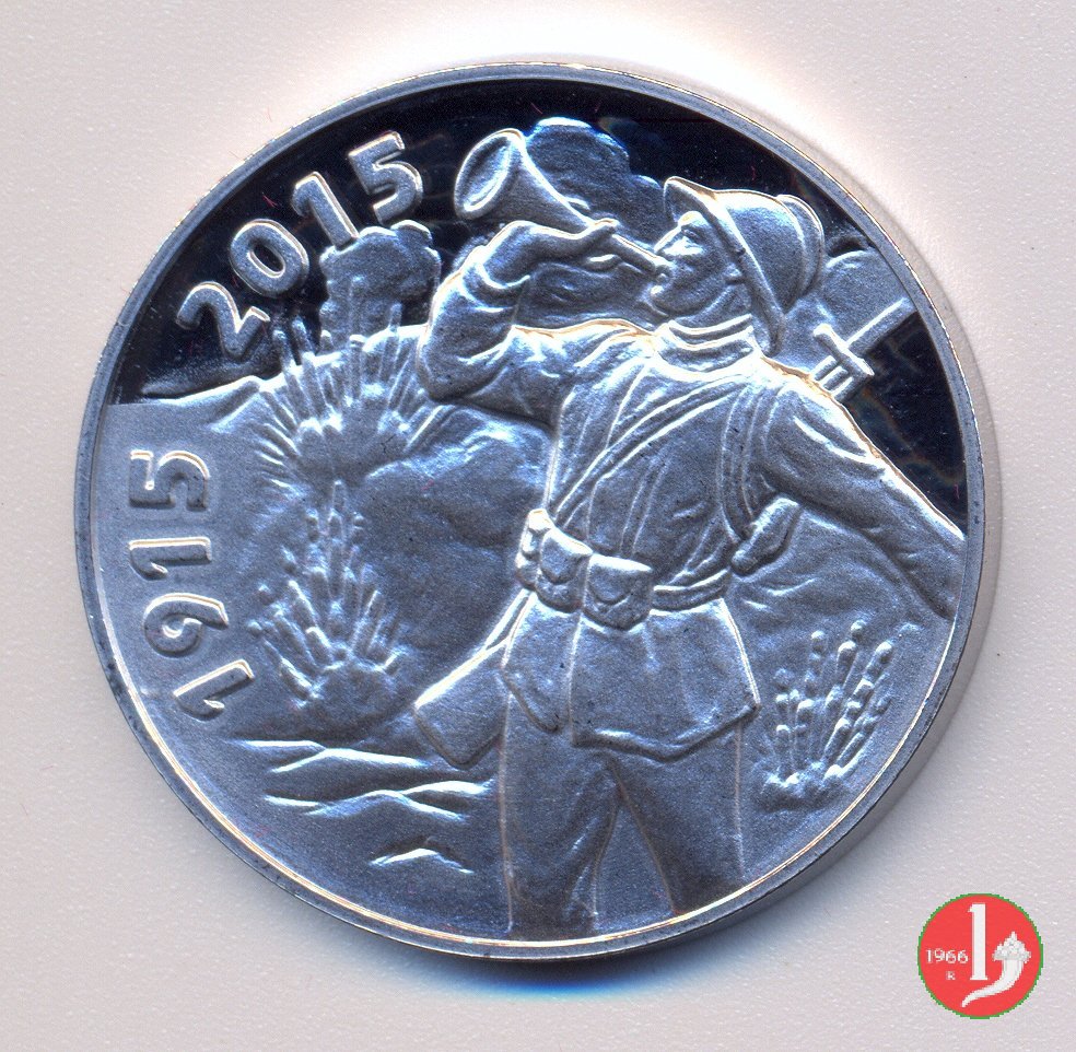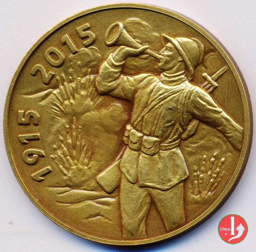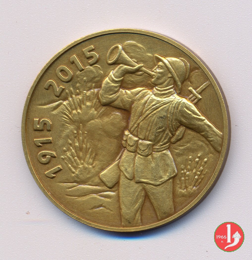 Medaglia coniata, emessa il 24-05-2015 per ricordare il centenario dell'entrata in guerra dell'Italia nella prima guerra mondiale. Il dritto è tratto dalla copertina del giornale settimanale dell'epoca “La tradotta”. Il verso riproduce il logo ufficiale del centenario. | |||||