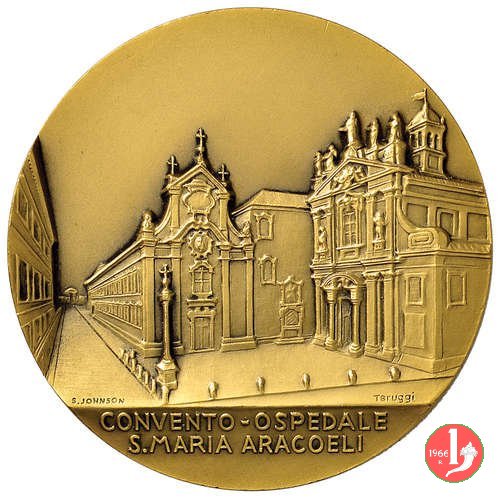 | Medaglia coniata, realizzata nel 1988, con fondo opaco o satinato, dallo Stabilimento Stefano Johnson di Milano, per ricordare il quarto centenario dei Fatebenefartelli a Milano e della costruzione dell'Ospedale di Porta Nuova a Milano (iniziato il 22 settembre 1588). | |||||