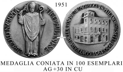 | Medaglia coniata, realizzata nel 1951 dal Circolo Numismatico Milanese. E' la seconda medaglia emessa dal Circolo di Milano. | |||||