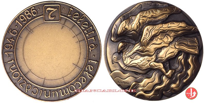 entro cornice con alcuni raggi diretti verso il centro: • TELETTRA • TELECOMUNICAZIONI • 1946 • 1986 •