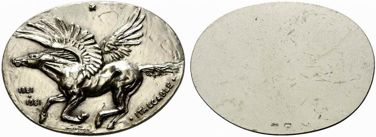 Medaglia coniata, realizzata nel 1981 a ricordo del sessantesimo anniversario di fondazione della Società Italcable Spa, specializzata in servizi per le telecomunicazioni.