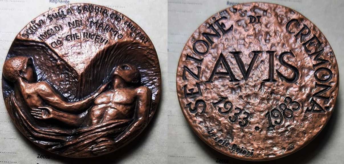 Medaglia coniata, realizzata nel 1983 a ricordo del cinquantesimo anniversario di fondazione della Sezione Cremonese dell'Avis.