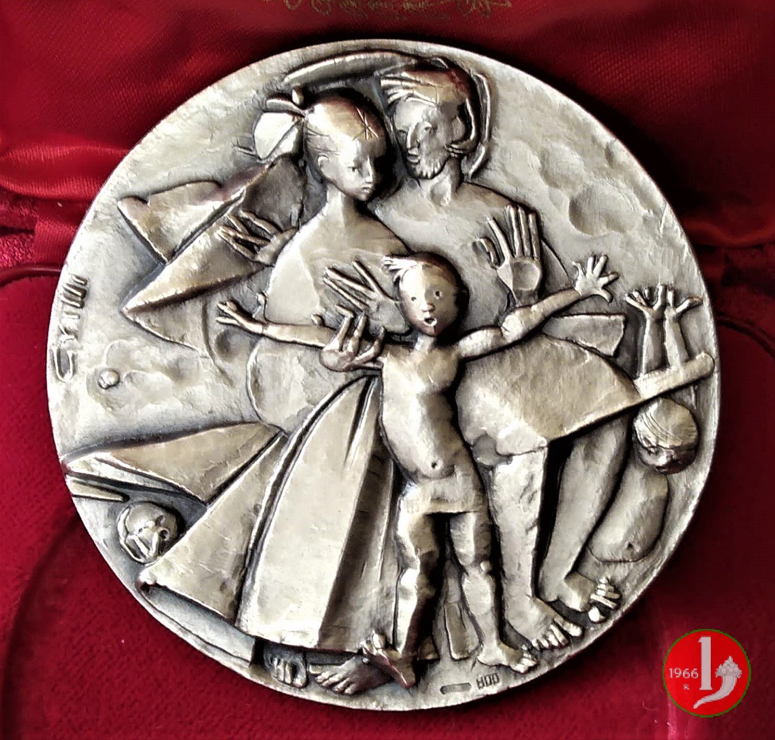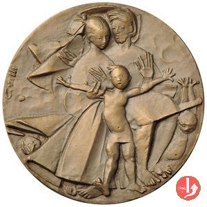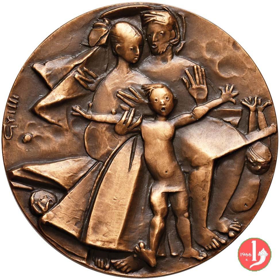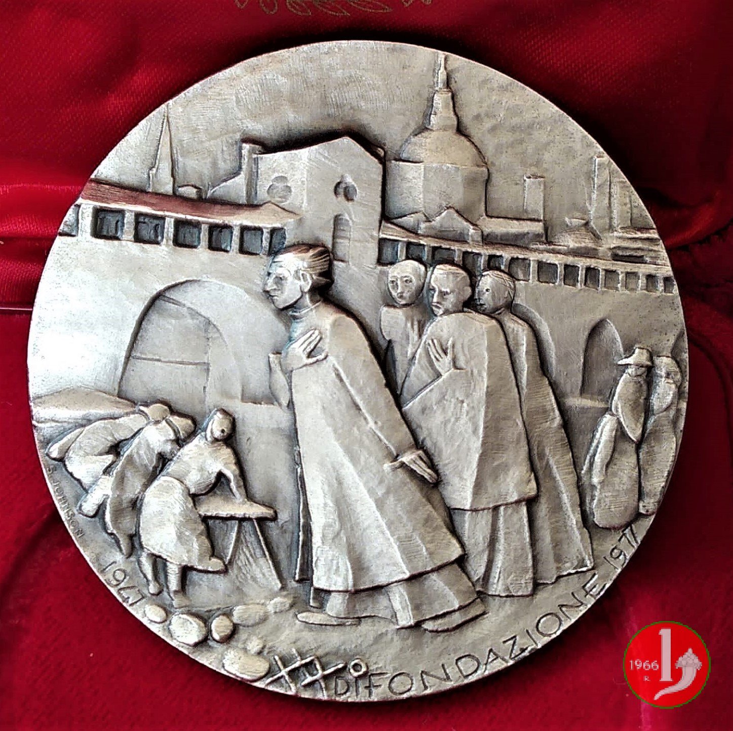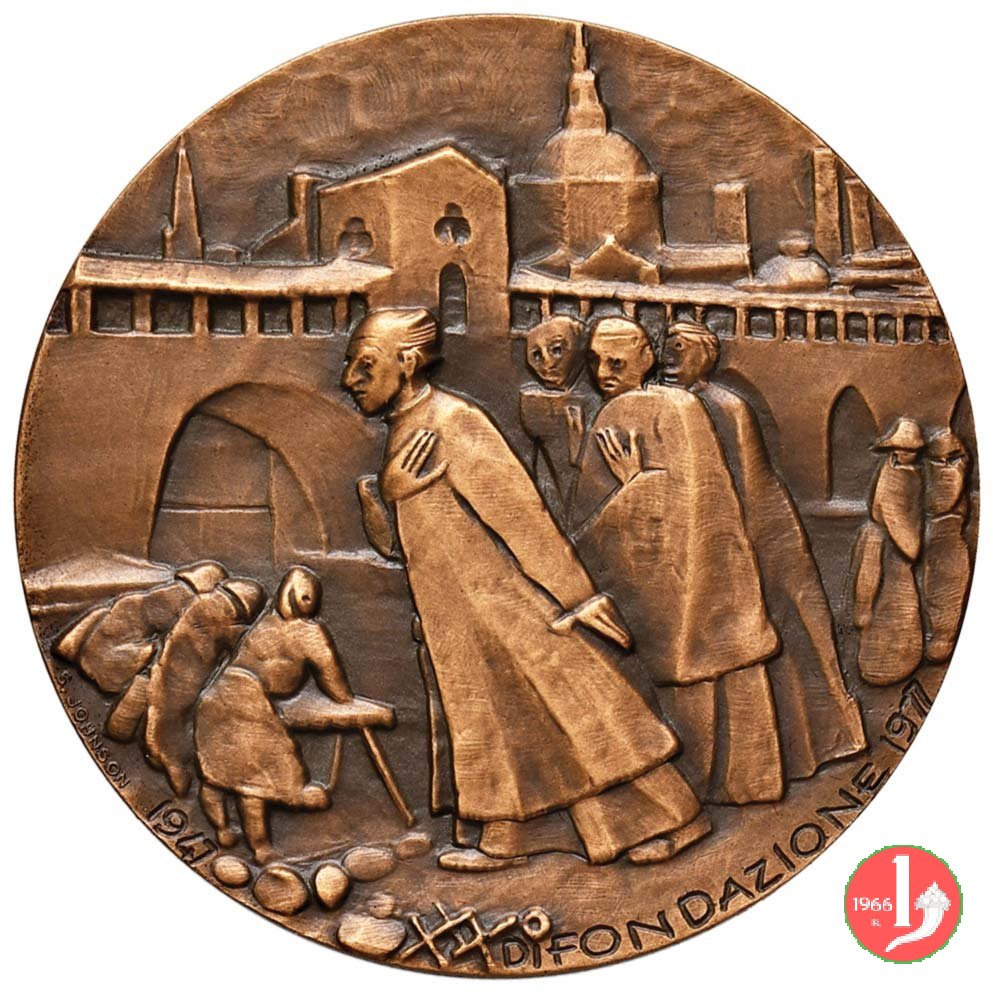 Medaglia coniata, realizzata nel 1977, con fondo opaco dallo Stabilimento Stefano Johnson di Milano, per ricordare il trentesimo anniversario della fondazione della Chiesa della Santa Famiglia in Pavia.