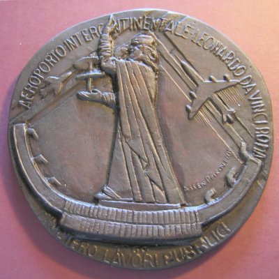 | Medaglia coniata, emessa nel 1960, per celebrare la realizzazione dell'Aeroporto Intercontinentale e della scultura di Leonardo da Vinci nei pressi dell'aeroporto di Roma - Fiumicino, opera di Assen Peikov. | |||||