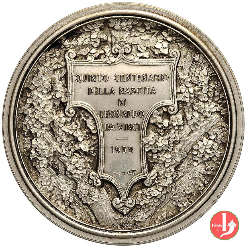 Medaglia coniata, realizzata nel 1952, con fondo opaco o satinato dallo Stabilimento Stefano Johnson di Milano, per ricordare il quinto centenario della nascita di Leonardo da Vinci.