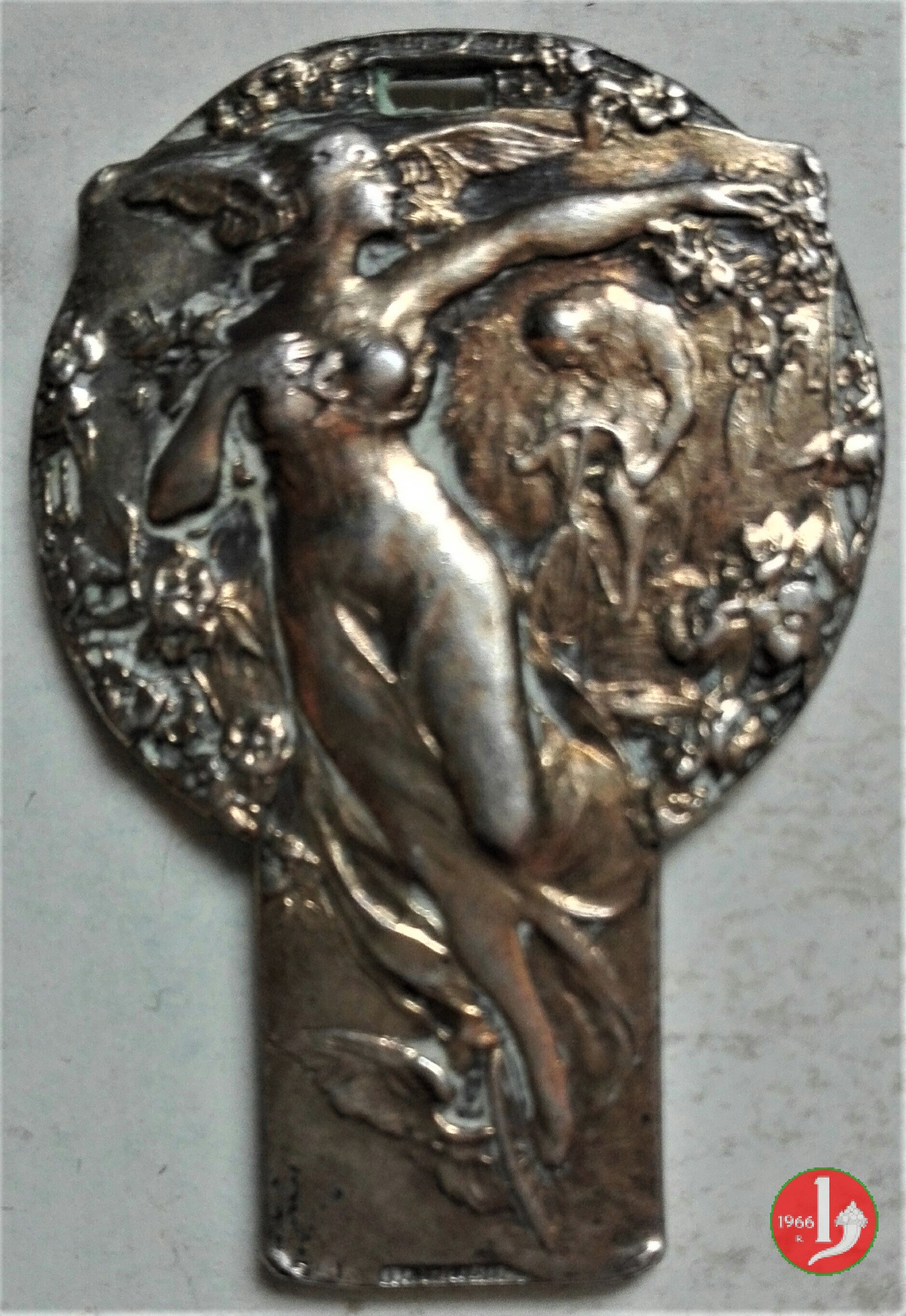 figura allegorica della vittoria drappeggiata, velata e alata di fronte e volta a dx, protende serto d'alloro a sx su tre ciclisti impegnati in corsa due targhe tra rami d'alloro