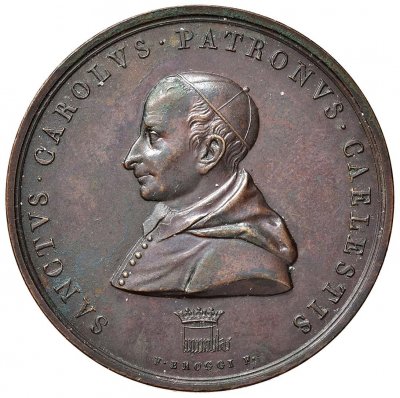 Medaglia coniata, emessa il 04-01-1838 per ricordare l'inizio lavori e la posa della prima pietra nella Chiesa di San Carlo al Corso. | ||||