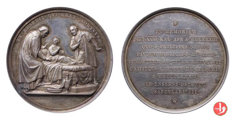 Medaglia coniata, realizzata nel 1883 a ricordo del terzo centenario del miracolo di S. Filippo Neri che il 16 marzo 1583 riportò in vita il giovane Paolo Massimo.Fu Commissionata da Camillo Carlo Massimo (1836-1921), Principe d'Arsoli. A Palazzo Massimo alle Colonne a Roma in occasione dell'anniversario è possibile visitare il luogo in cui tale miracolo avvenne in particolare, la stanza trasformata in cappella | ||||||