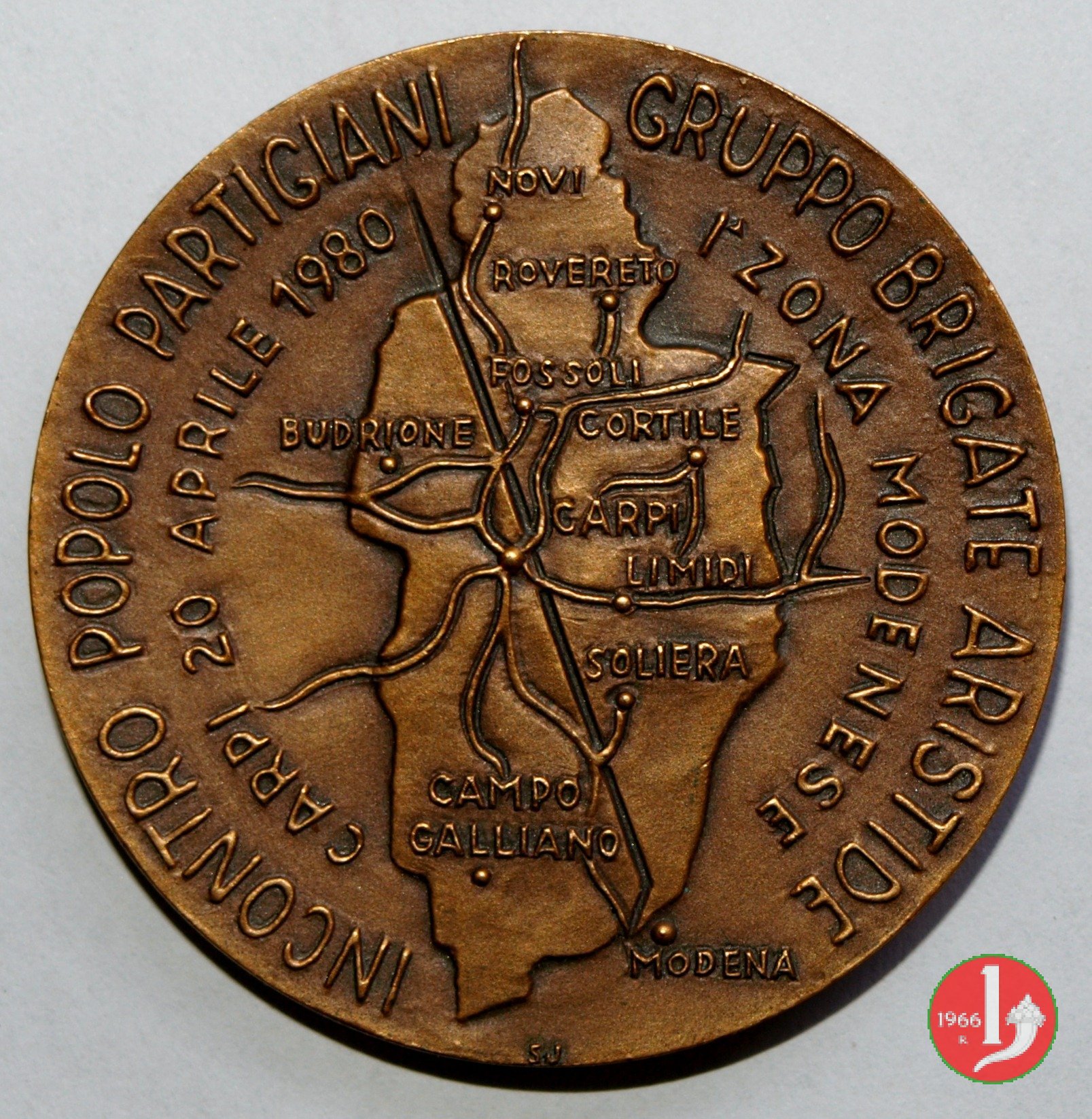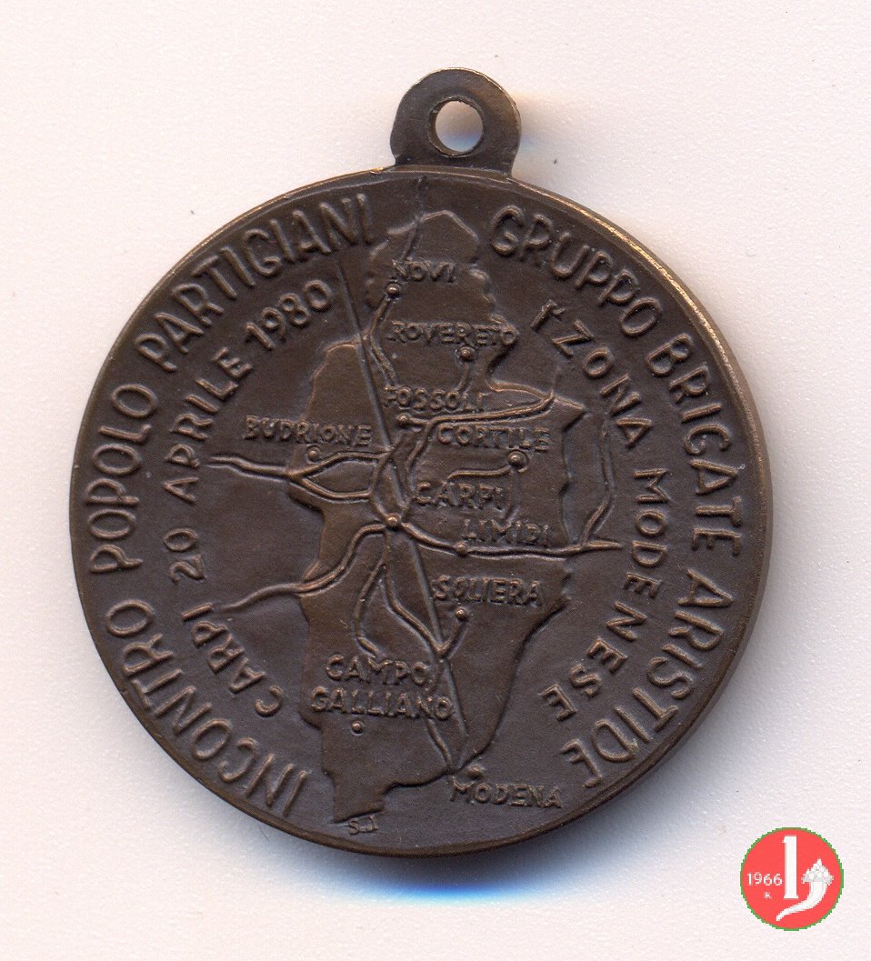 Un gruppo di giovani oppone alla dittatura gli ideali di: RESISTENZA - COSTITUZIONE - LIBERTA' INCONTRO POPOLO PARTIGIANI GRUPPO BRIGATE ARISTIDE CARPI 20 APRILE 1980 1a ZONA MODENESE Al centro topografia del comprensorio di Carpi