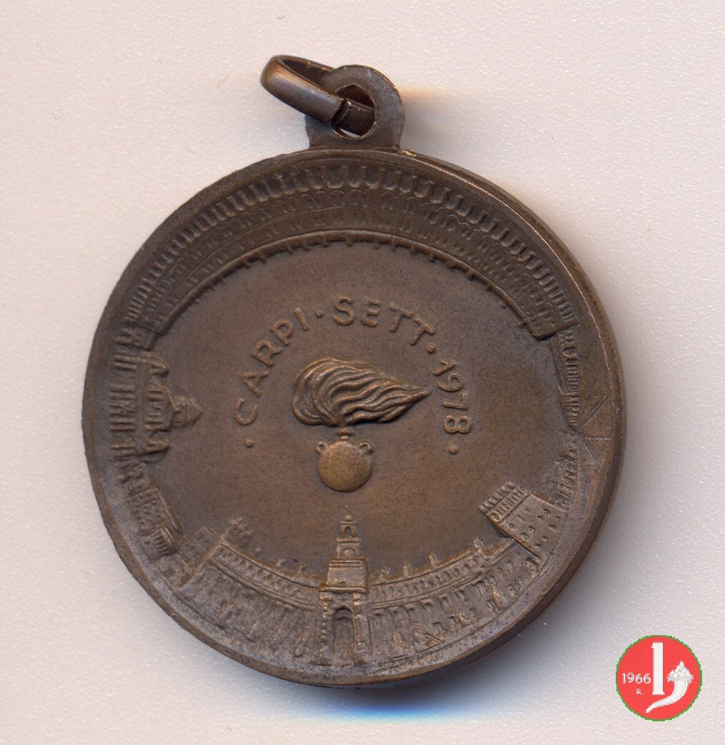 Leggenda semicircolare su 3 righe e busto idealizzato dell'EROE Castello dei Pio, piazza Fanti e la Cattedrale di Carpi disposti circolarmente