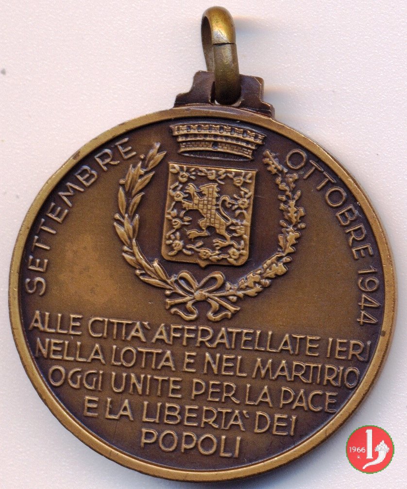 Leggenda :SETTEMBRE OTTOBRE 1944 all'esergo sotto lo stemma Comunale leggenda su 5 righe : ALLE CITTA ' AFFRATTELLATE IERI / NELLA LOTTA E NEL MARTIRIO / OGGI UNITE PER LA PACE / E LA LIBERTA ' DEI / POPOLI