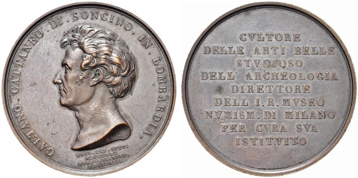 Medaglia coniata, realizzata nel 1841 per ricordare Gaetano Cattaneo, direttore del Museo Numismatico di Milano e poeta.