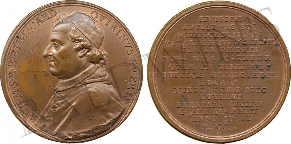 | Medaglia coniata, realizzata nel 1750, per ricordare il Cardinale Angelo Maria Querini o Quirini (1680-1755) prefetto della Biblioteca apostolica vaticana. | |||||
