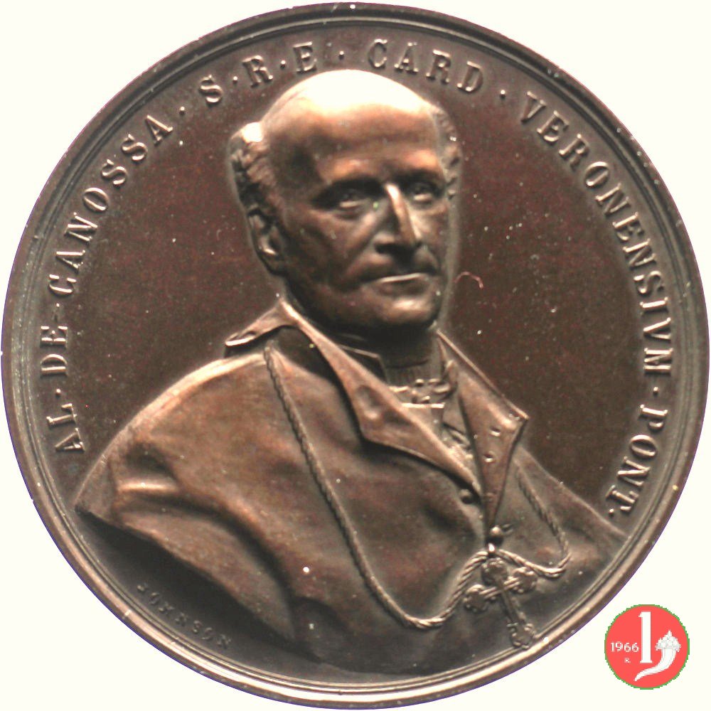 | Medaglia coniata, emessa il 13-05-1891, dallo Stabilimento Stefano Johnson di Milano, per ricordare il cinquantesimo anniversario di Sacerdozio del Cardinale Luigi di Canossa (1809-1900). | ||||