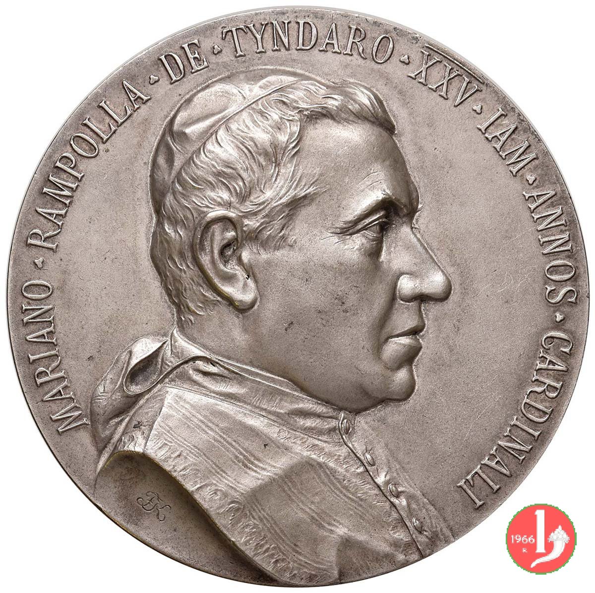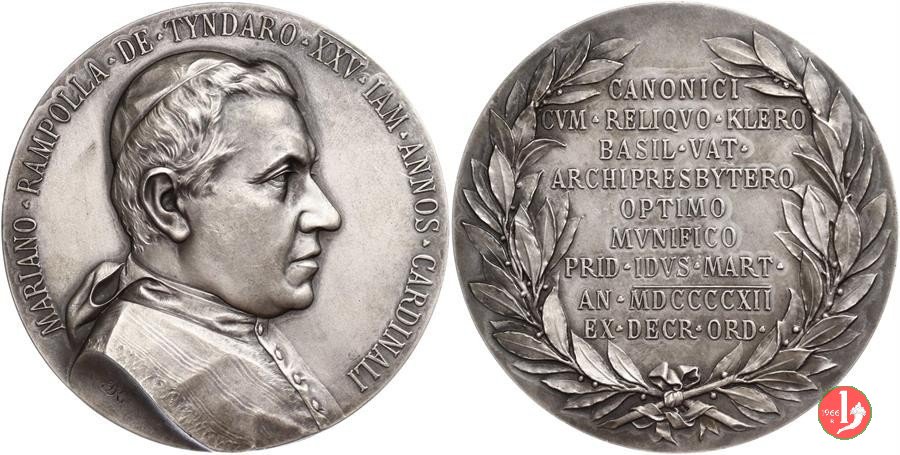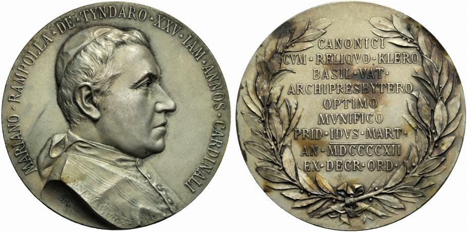 | Medaglia coniata, realizzata nel 1912 a ricordo del venticinquesimo anniversario della nomina a Cardinale di Mariano Rampolla del Tindaro (1843 - 1913), già Segretario di Stato di Leone XIII. | ||||||