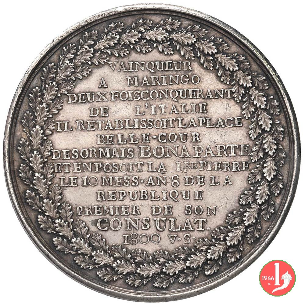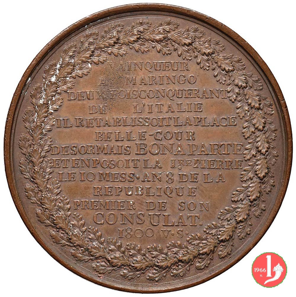 entro corona d'alloro: VAINQUEUR = A MARINGO = DEUX FOIS CONQUERANT = DE L'ITALIE = IL RETABLISSOIT LA PLACE = BELLE-COUR = DESORMAIS BONAPARTE = ET EN POSOIT LA IRE. PIERRE = LE I0 MESS. AN 8 DE LA = REPUBLIQUE = PREMIER DE SON = CONSULAT = 1800 V. S.