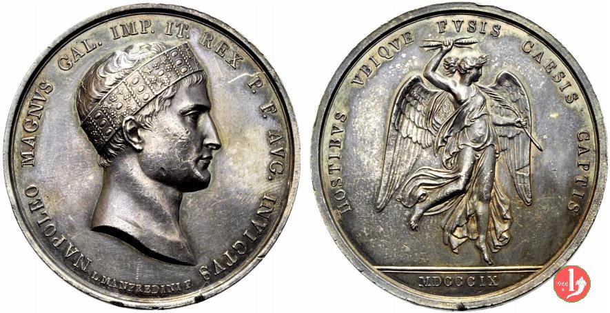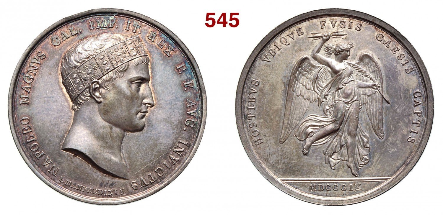 Medaglia coniata, emessa 06-07-1809 per ricordare la Battaglia di Wagram ( presso l'Isola di Lobau sul fiume Danubio e nella piana del Marchfeld attorno al villaggio di Deutsch-Wagram) e la Vittoria di Napoleone contro gli Austriaci.