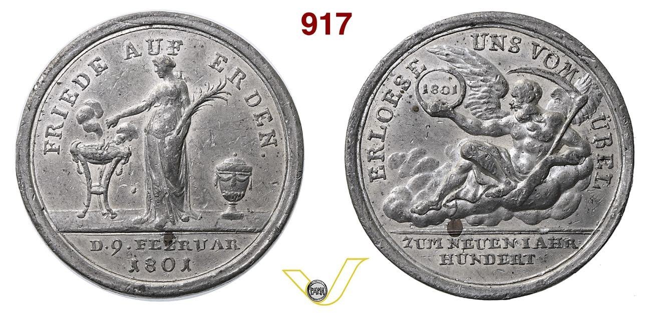 Medaglia coniata, realizzata nel 1801 a ricordo del Trattato di Luneville tra la Francia e Germania, a seguito della battaglia di Marengo e riguadante i domini su alcuni Stati italiani.