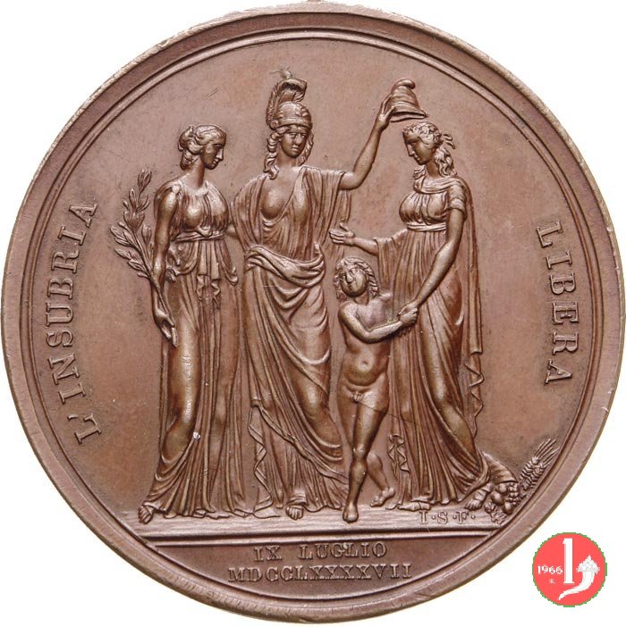 | Medaglia coniata, emessa il 29-06-1797 a ricordo della costituzione della Repubblica Cisalpina e i festeggiamenti a Milano. | |||||||