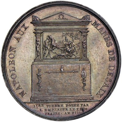 | Medaglia coniata, emessa il 24-05-1805 per ricordare l'erezione del monumento al Generale Desaix al Gran San Bernardo, nel quinto anniversario della Battaglia di Marengo. | |||||||