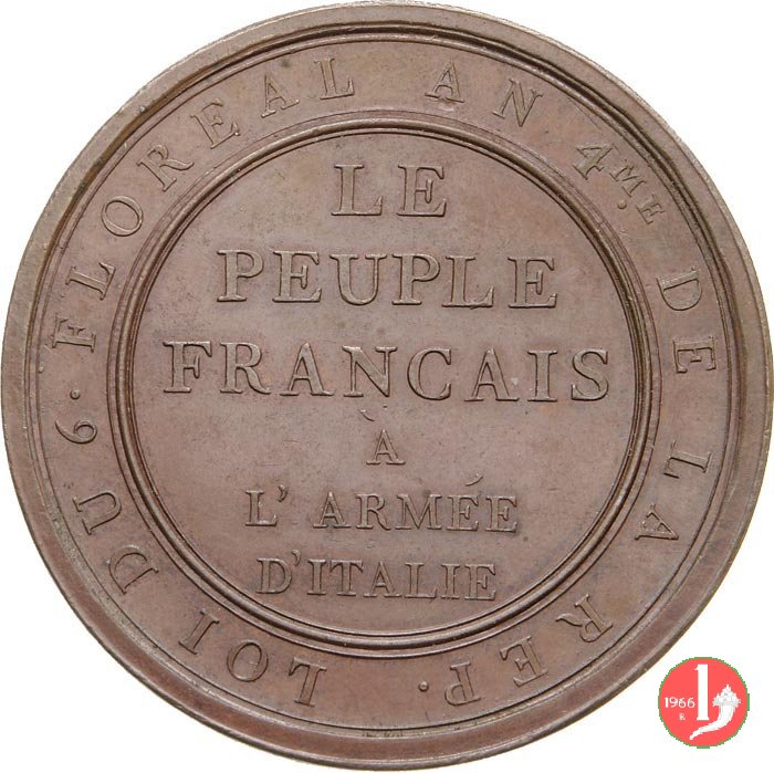 | Medaglia coniata, realizzata per ricordare le Battaglie di Millesimo e di Dengo (Savona) del 13 e 14 Aprile 1796. Carlo Lavy incise traendone i soggetti da disegni del pittore Andrea Appiani. La medaglia originale coniata dalla zecca di Milano presenta generalmente il contorno con la legenda: BONAPARTE GENERAL EN CHEF | ||||||
