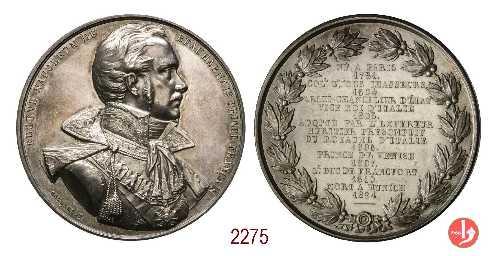 tra rami d'alloro fermati in basso da nastro e borchia: NÉ A PARIS = 1781 • = COL • Gal DES CHASSEURS = 1804 • = ARCHI-CHANCELIER D'ÉTAT = VICE ROI D'ITALIE = 1805 • = ADOPTÉ PAR L'EMPEREUR = HÉRITIER PRÉSOMPTIF = DU ROYAUME D'ITALIE = 1806 • = PRINCE DE VENISE = 1807 • = GD DUC DE FRANCFORT = 1810 • = MORT A MUNICH = 1824 •