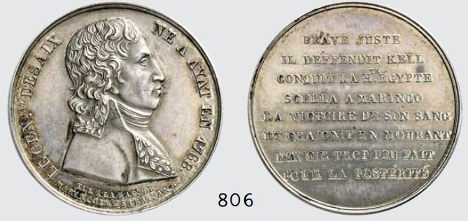 | Medaglia coniata, realizzata nel 1800 a ricordo della morte del Generale Lecen Desaix a Marengo. | |||||||