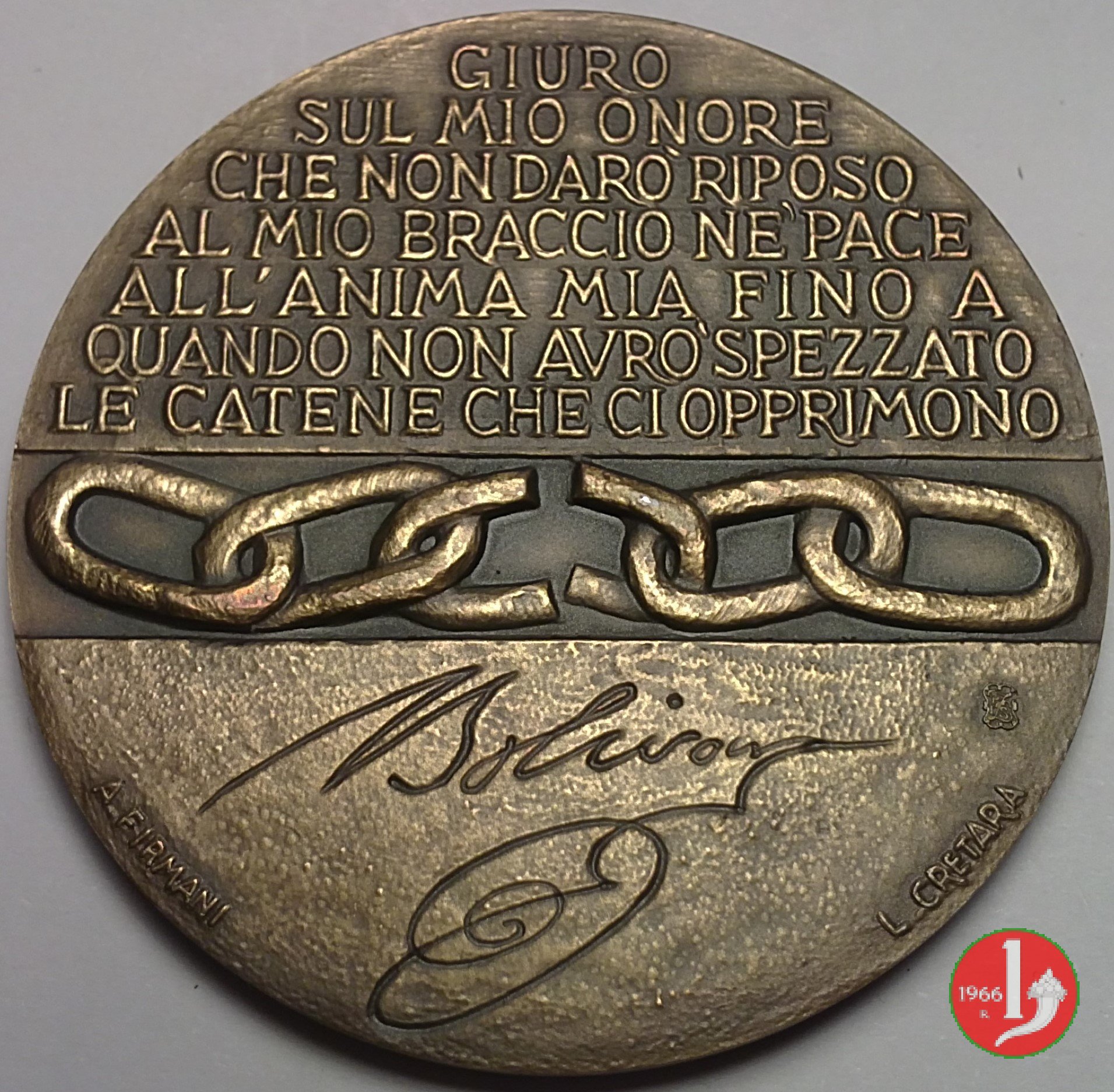 in alto: GIURO = SUL MIO ONORE = CHE NON DARO' RIPOSO = ALL'ANIMA MIA FINO A = QUANDO NON AVRO' SPEZZATO = LE CATENE CHE CI OPPRIMONO