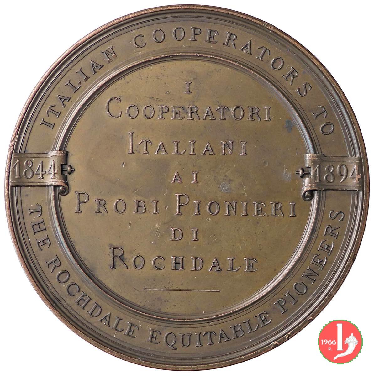 | Medaglia coniata, realizzata nel 1894 a ricordo del cinquantesimo anniversario dei pionieri della cooperazione sociale di Rochdale (Inghilterra). | |||||
