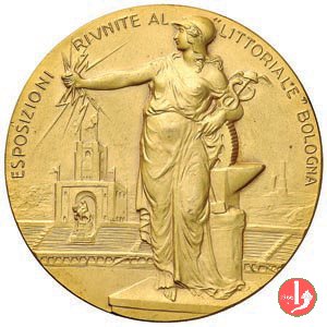 Minerva, in piedi, volta a sx, regge caduceo e fascio di saette, sullo sfondo stadio e monumenti di Bologna