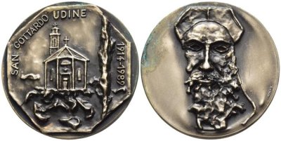 Medaglia coniata realizzata nel 1989 a ricordo del restauro e della riapertura al culto nel 1914 della. Chiesa di San Gottardo ad Udine. | |||