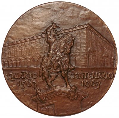 Medaglia di massimo modulo coniata, realizzata nel 1963, a ricordo del quarto centenario dell'Istituto Bancario San Paolo di Torino. La presente medaglia riutilizza il conio del Dritto realizzato nel 1905 e opportunamente modificato nelle legende per l'Istituto. | ||||||