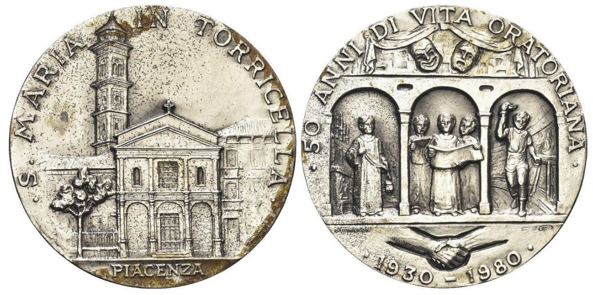 Medaglia coniata, emessa nel 1980 con fondo opaco, dallo Stabilimento Stefano Johnson di Milano, a ricordo del 50° Anniversario degli Oratoriani in Santa Maria in Torricella a Piacenza. | |||||