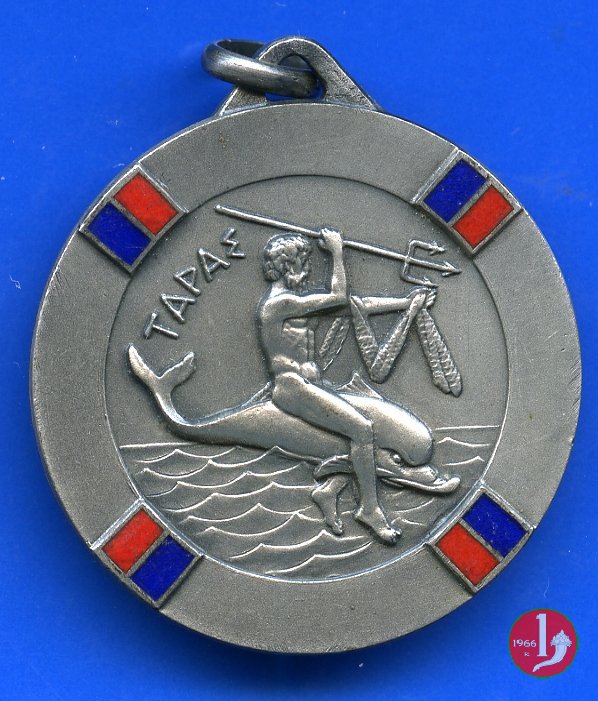 entro ampia cornice con quattro quadrati smaltati bicolori blu e rosso: Riproduzione di antica moneta con tritone volto a dx con fiocina su delfino