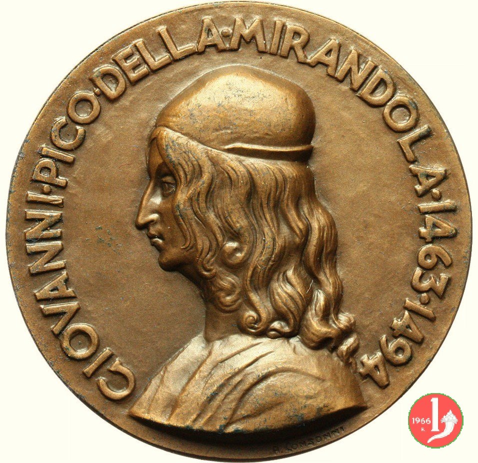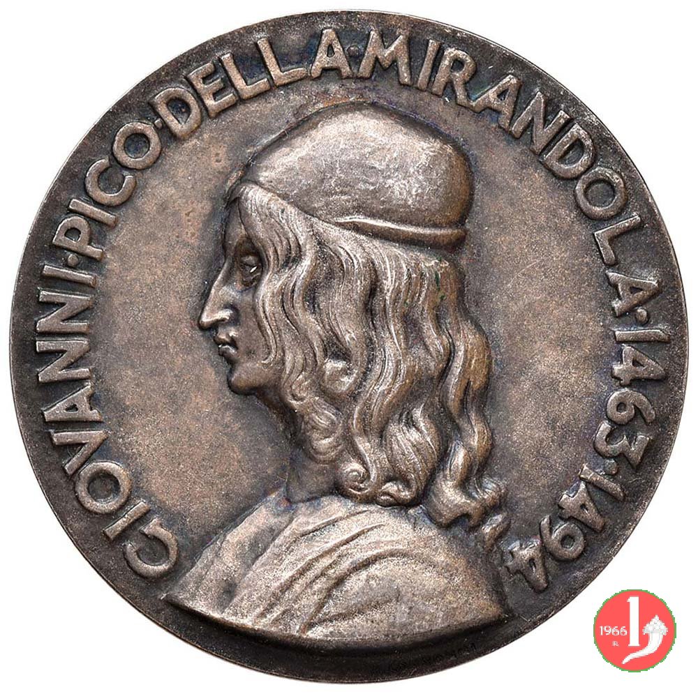 | Medaglia coniata, realizzata nel 1963 con fondo opaco, dallo Stabilimento Stefano Johnson di Milano, per ricordare il quinto centenario della nascita di Pico della Mirandola. | |||||