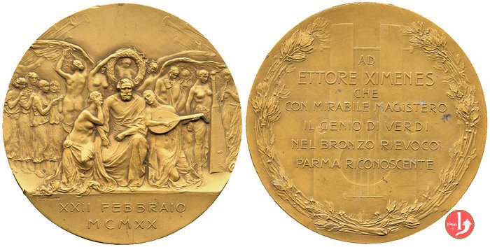 nel campo, tra rami d'alloro e su lira: AD = ETTORE XIMENES = CHE = CON MIRABILE MAGISTERO = IL GENIO DI VERDI = NEL BRONZO RIEVOCO' = PARMA RICONOSCENTE