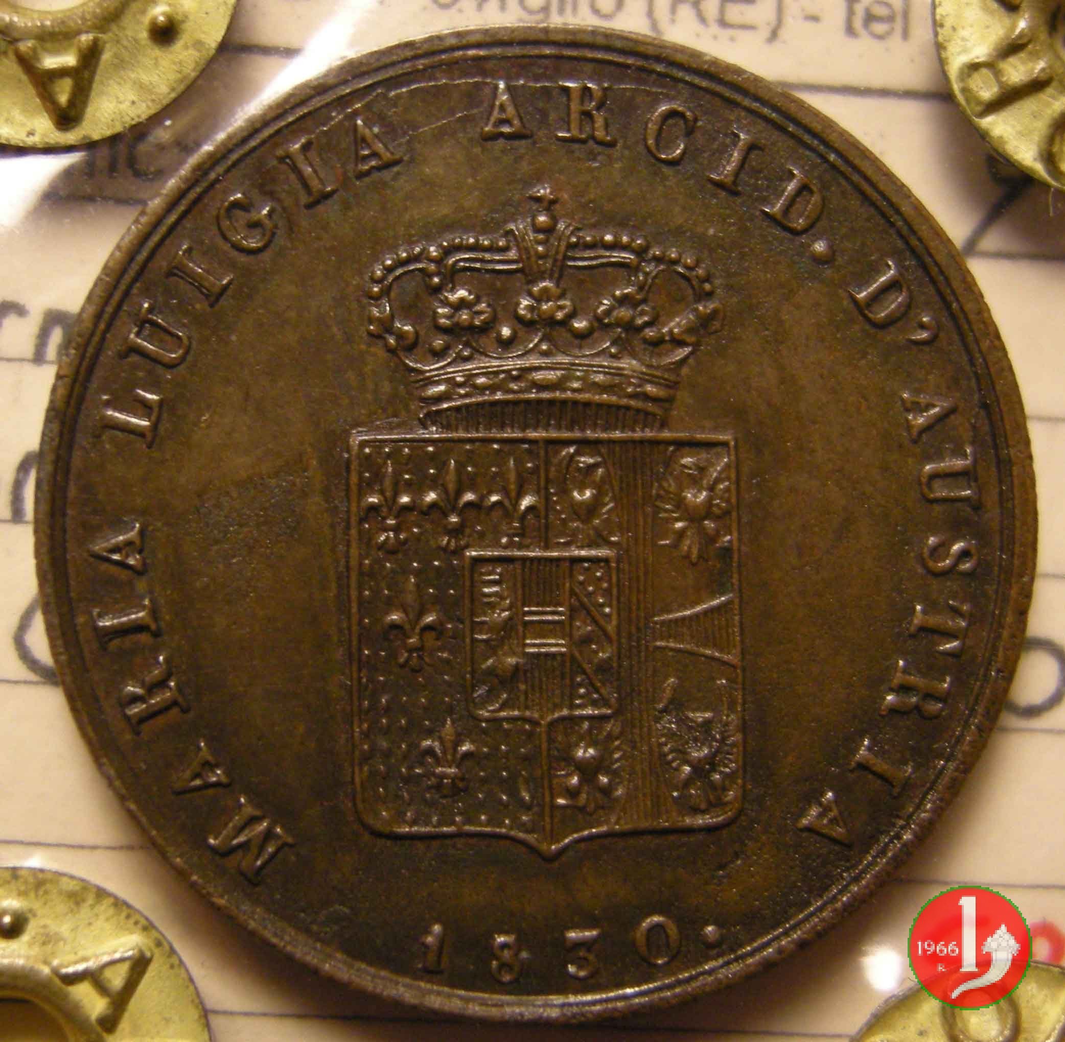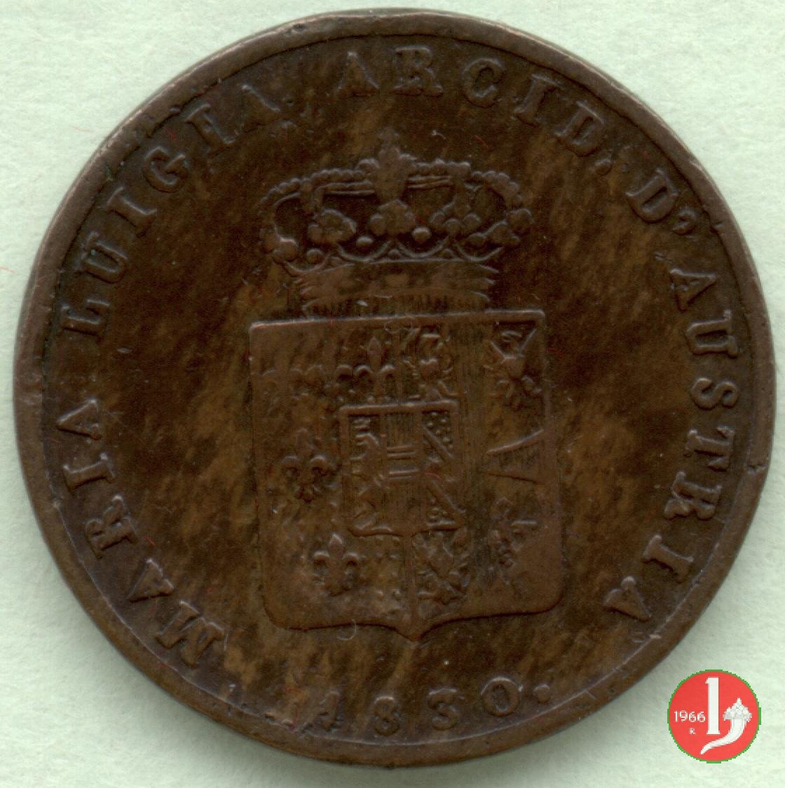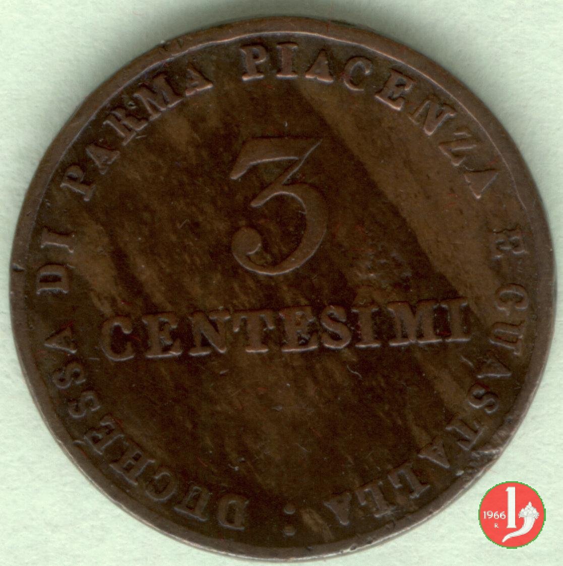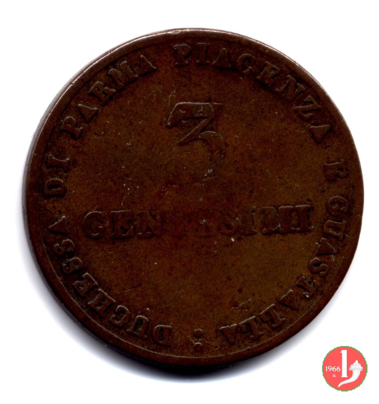 Stemma della Duchessa sormontato da una corona Ducale, contornato dalla scritta: MARIA LUIGIA ARCID. D'AUSTRIA. Sotto la data: 1830. Nel campo indicazione del valore (3 CENTESIMI) su due righe, intorno: DUCHESSA DI PARMA PIACENZA E GUASTALLA :.